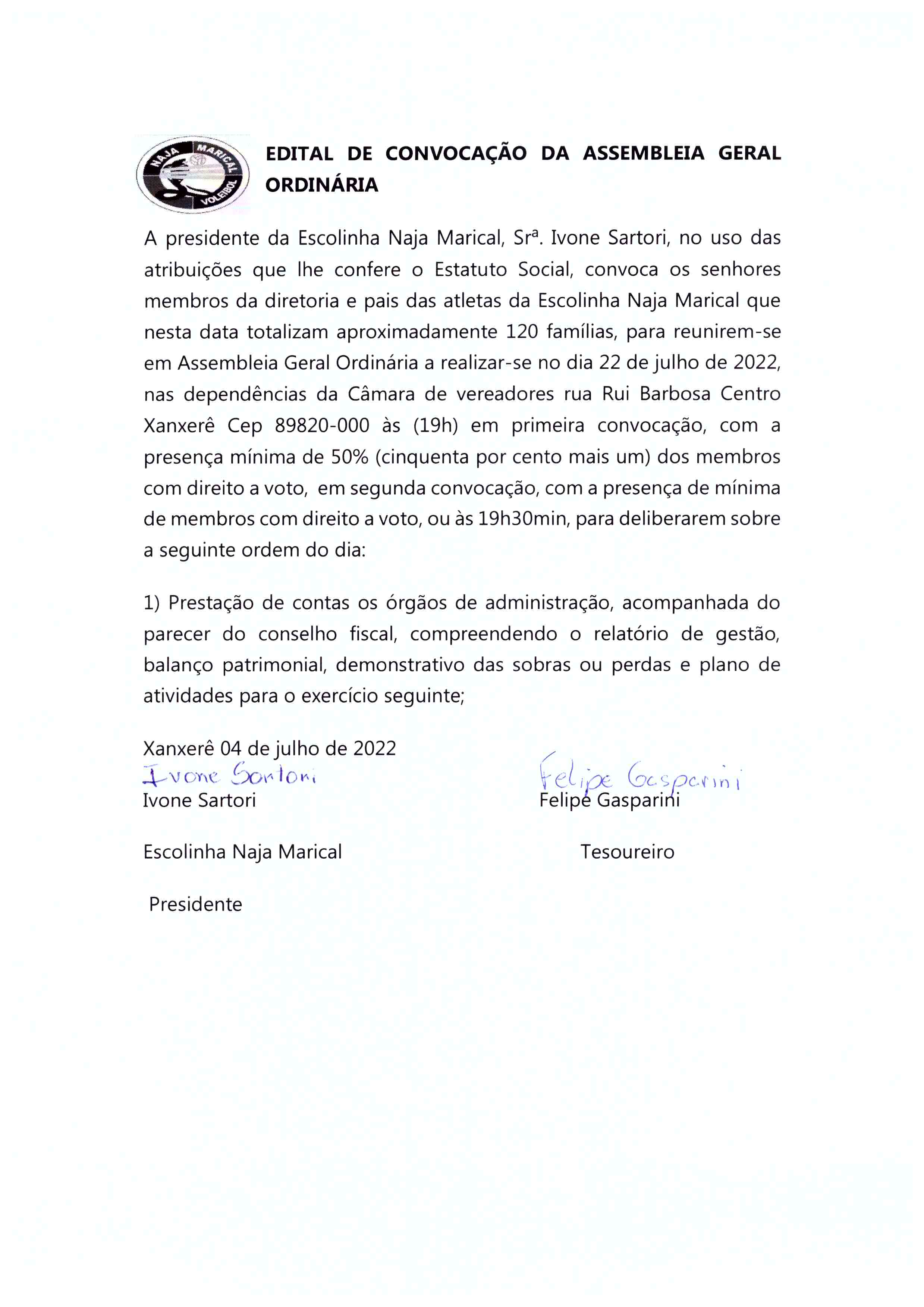 A Direção da Escolinha Naja Marical, vem por meio deste publicar, Edital de Convocação para assembleia a ser realizada no dia 22 de julho de 2022. Inicio as 19:00hrs